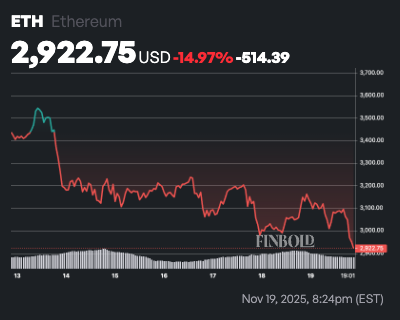 この記事の執筆時点では、イーサリアムは2,921ドルで取引されており、過去24時間で7%以上下落し、過去1週間で15%近く下落した。