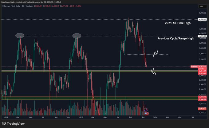 一方、暗号アナリストによる別の分析では、注目すべき主要な価格レベルが特定されました。同氏は、2,800ドルと4,100ドルが依然として重要なサポートゾーンとレジスタンスゾーンであり、過去2年間の価格動向を形成してきたと指摘した。