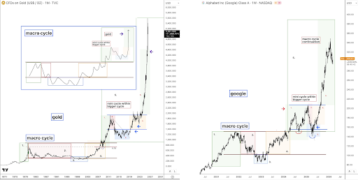 この読み方は、金とアルファベットと並べるとさらに面白くなります。どちらの例でも、価格はより大きなマクロサイクル内で上昇し、サイクル半ばの調整のために一時停止し、その小さなリセットが完了すると再び上昇しました。