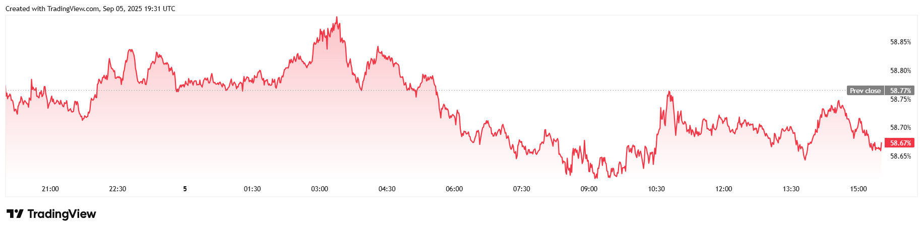 24時間の取引量は24時間で5.14%上昇し、60.09億ドルに達しました。また、時価総額は木曜日から1.21%上昇し、執筆時点で2.21兆ドルでした。しかし、ビットコインの優位性は58.66%で0.19%減少しました。