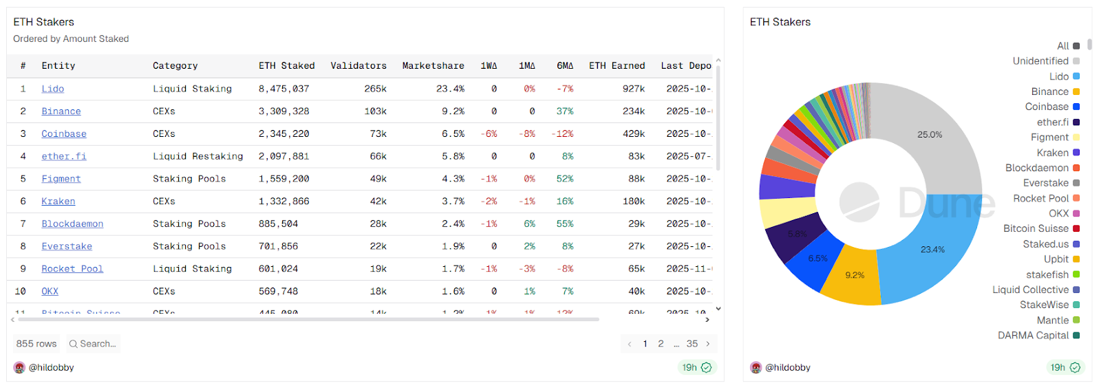 ブロックチェーン分析プラットフォームDuneのデータによると、本稿執筆時点では、分散型ステーキングプロトコルLidoが26万5,000のバリデーターにわたって840万ETH以上をステーキングし、23%以上のシェアを保持し市場をリードしている。集中型取引所のBinanceとCoinbaseがそれに続き、それぞれステーキングされたETHの約9.2%と6.5%を占めています。