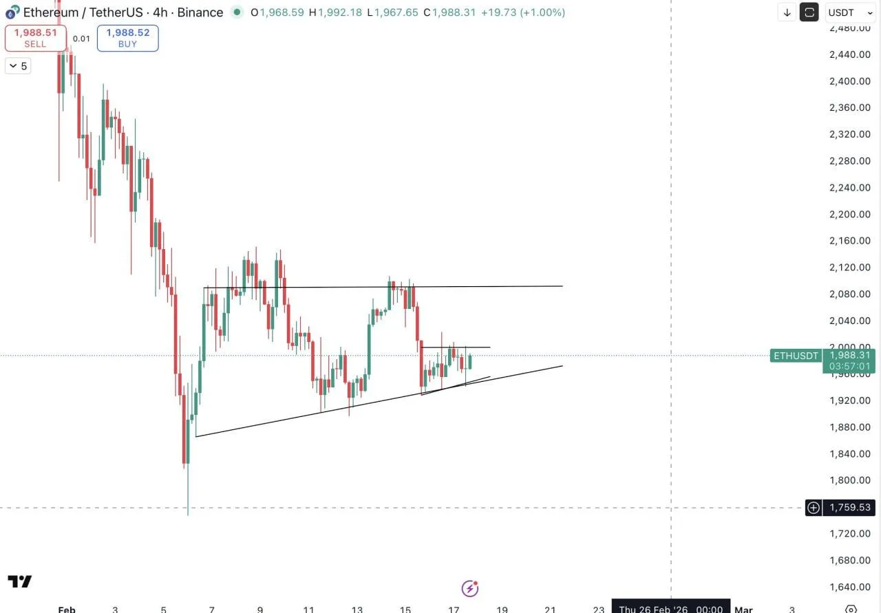 イーサリアム 月初めに急落した後、価格は2,000ドルレベル付近の狭いバンド内で推移し、2月17日の日次バイナンスETHUSDT永久チャートでは1,977ドル付近で取引された。
