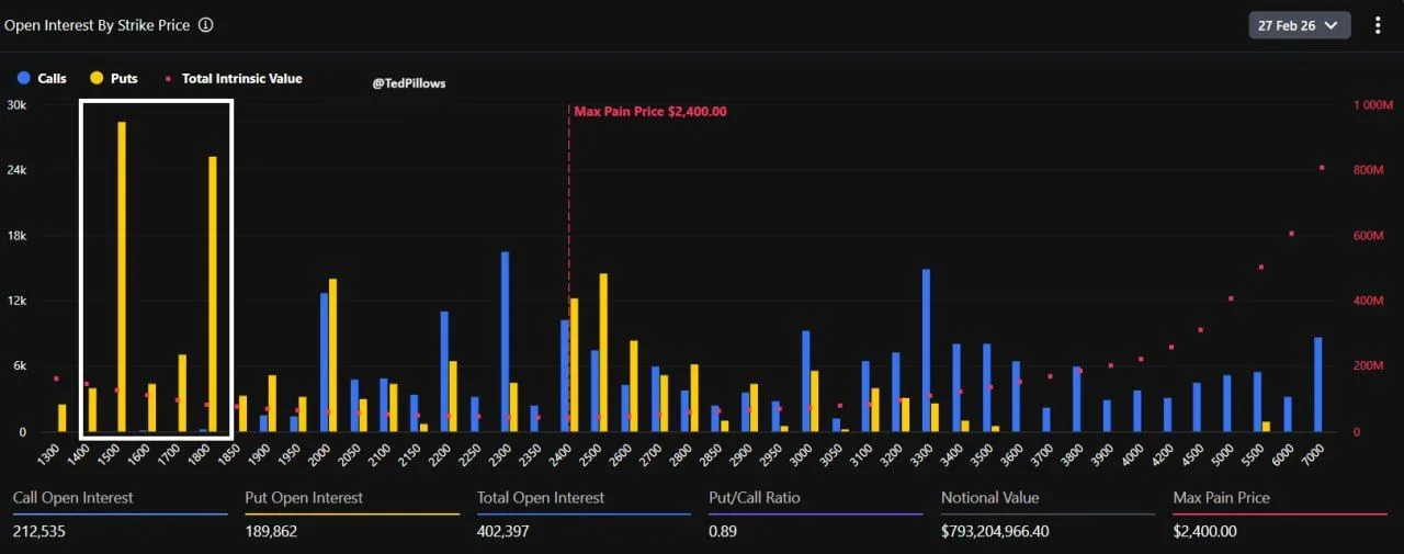 同じチャートは、オプション売り手の本源価値総額が満期時に最低となる2,400ドル付近の最大の痛みレベルをマークしている。と $ETH この基準を大きく下回る水準で取引されていることから、現在のポジショニングは、トレーダーが2月の窓のより広い下値幅を織り込んでいる一方で、遠くのストライキで上値エクスポージャーをオープンにしておくことを示唆している。