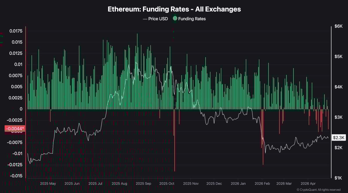 最近のデータセットを通じて資金調達率が継続的かつ大幅にマイナスとなっているビットコインとは異なり、イーサリアムの資金調達状況はより複雑です。現在の読み取り値 -0.0044 はマイナスですが、チャートは次のことを示しています。 $ETHの資金調達は、ビットコインの同等のチャートで見られる容赦ない赤いバーの優位性を維持するのではなく、4月の大部分の間、適度なマイナスと適度なプラスの間で揺れ動いています。