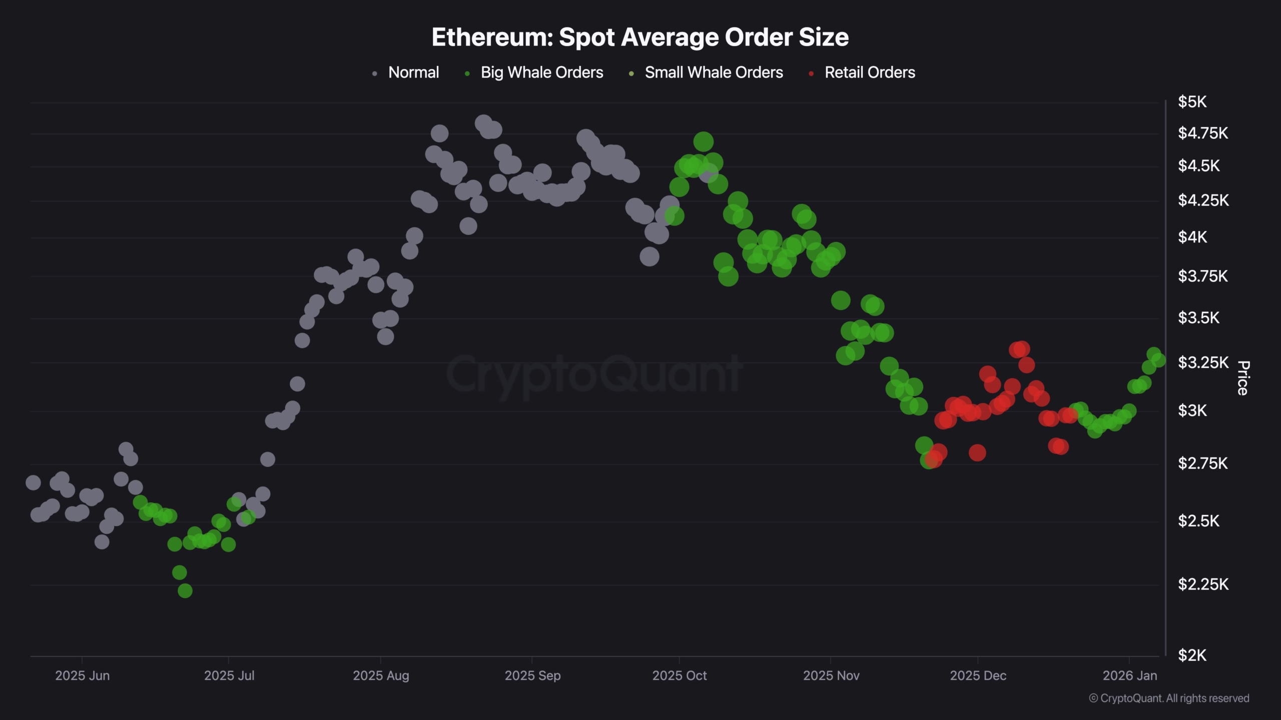 オンチェーンの観点から見ると、イーサリアムのスポット平均注文サイズのチャートは重要な行動の変化を示しています。最近の緑色のスポットの出現と集中は、現在の価格回復中にクジラサイズのスポット購入者の参加が増加していることを示しています。これは、小売規模の注文が大半を占めていた時期を経て、大規模な参加者が再び活発になっていることを示唆しています。