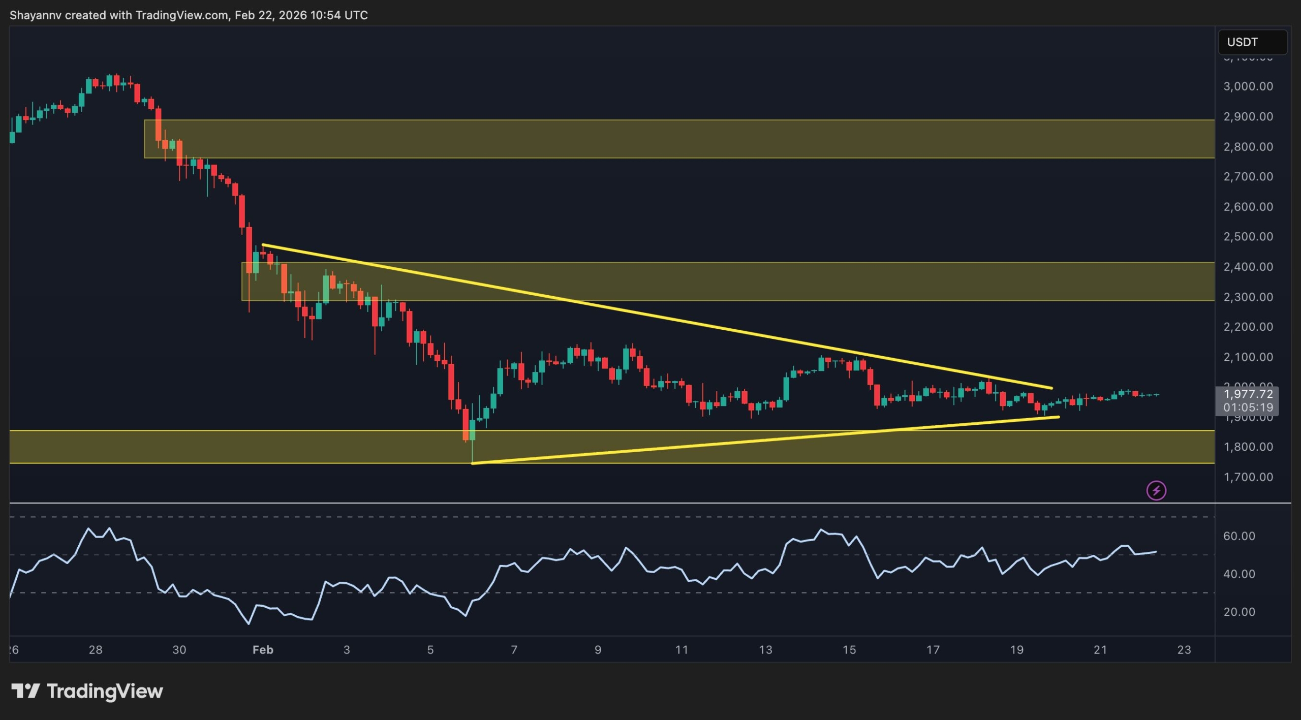 2,000~2,100ドルの高値を突破できれば、短期的な勢いの変化の最初のシグナルとなり、2,300~2,400ドルのレジスタンスバンドに向けた動きが始まる可能性がある。逆に、1,800ドルの基準を失うと、統合理論は無効となり、より深いサポートレベルへの新たな下値圧力を引き起こす可能性があります。