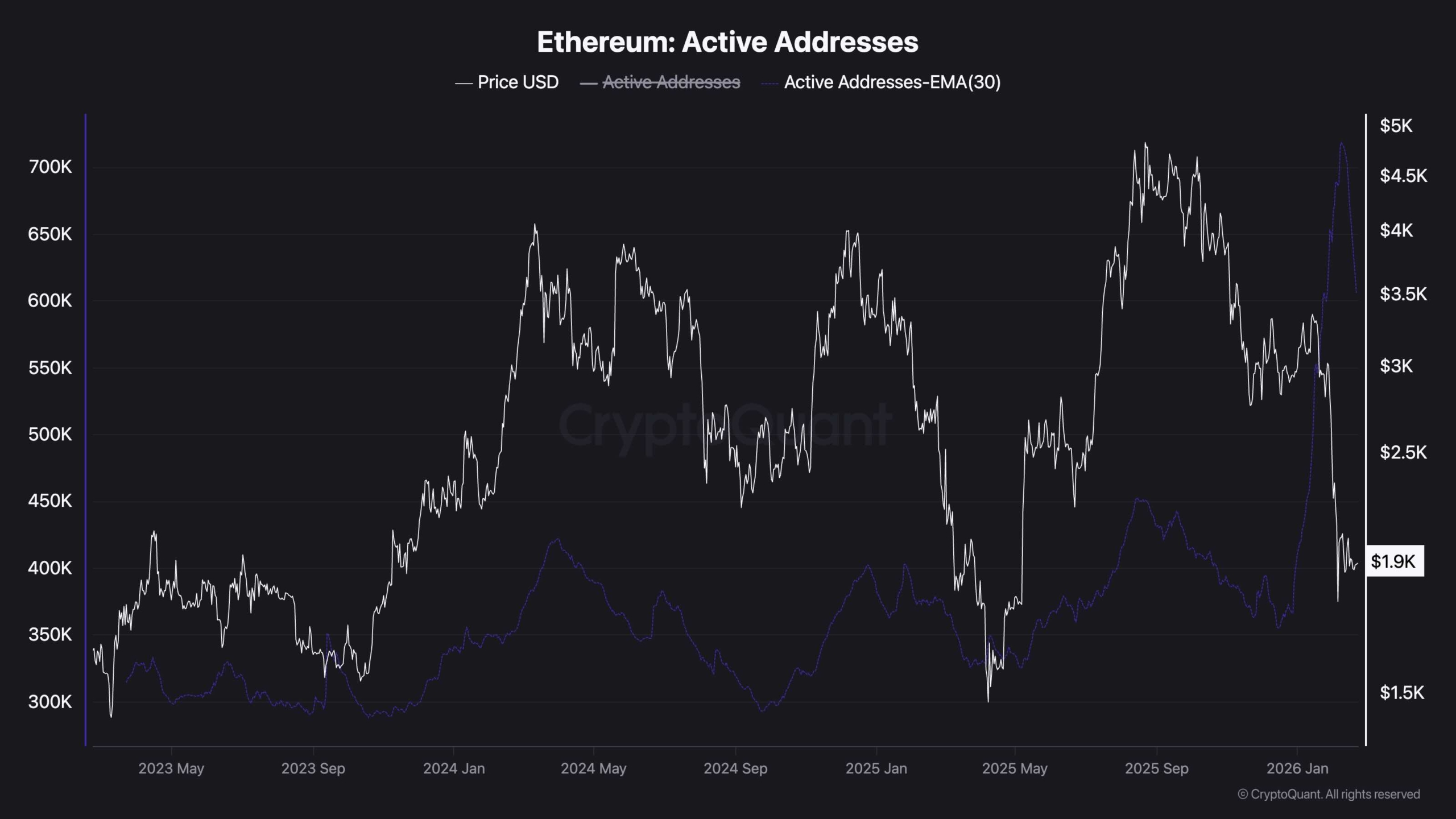 アクティブ アドレス データによると、最近ネットワーク アクティビティが急激に急増しており、アクティブ アドレスの 30 日間 EMA が数か月ぶりの高値に急増しています。歴史的に、同様の活動の拡大はボラティリティの高まりの時期と一致しており、多くの場合、大きな方向性の動きに先立って行われてきました。