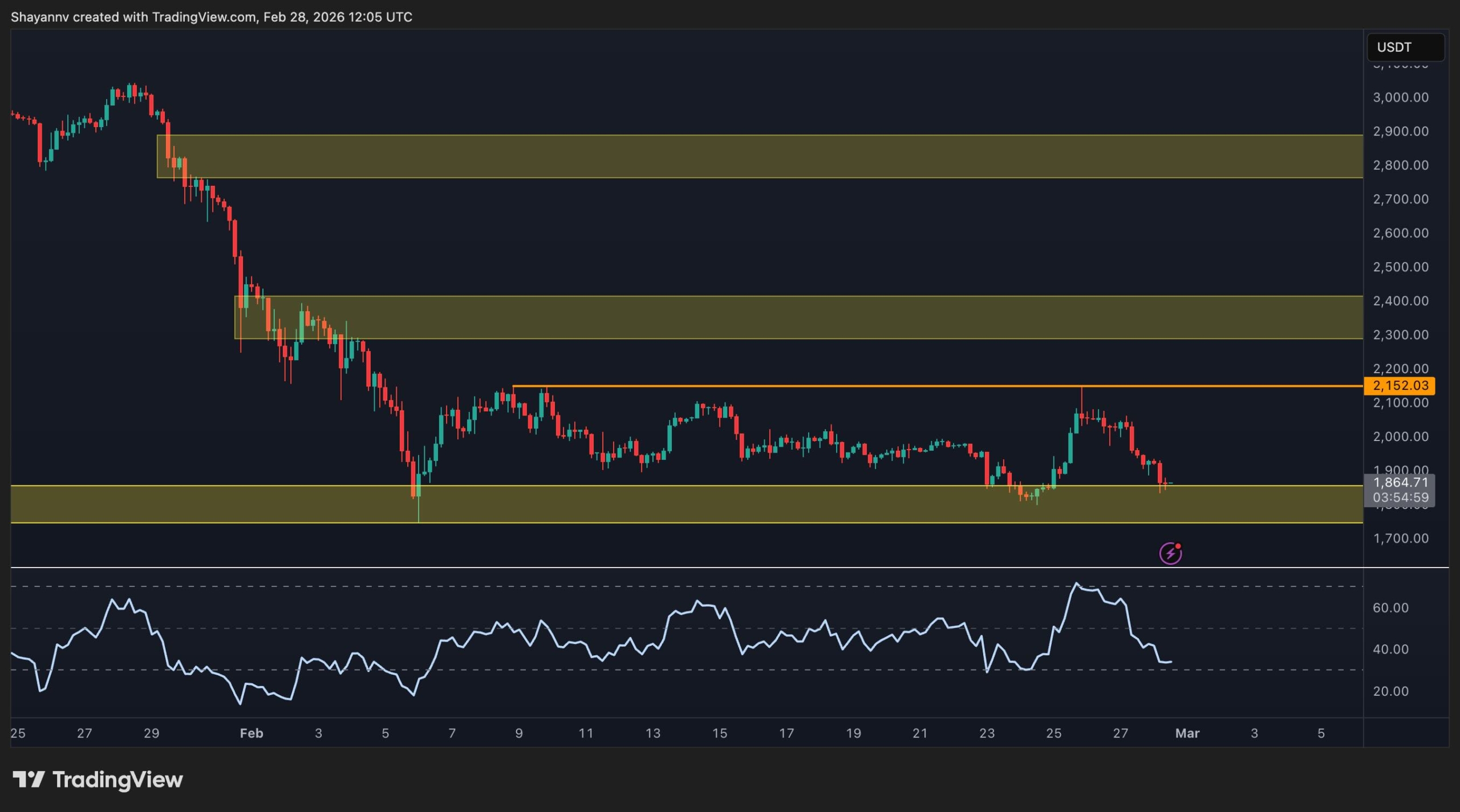 $ETH は依然として明らかな下降傾向にあり、市場はマクロリスクと地政学の両方に素早く反応しています。中東戦争でさらなる不確実性が高まっているため、イーサリアムはチャート上の1,800エリア付近に位置しており、まさに買い手が何度も防衛を試みてきた重要な需要ゾーンに位置している。