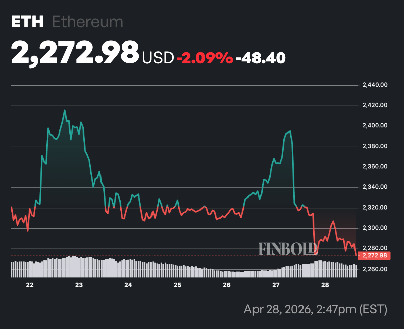 この記事の執筆時点では、イーサリアムは2,274ドルで取引されており、過去24時間で2%近くわずかに修正されました。週ベースでは、時価総額で2位にランクされている仮想通貨も同様のマージンで下落している。