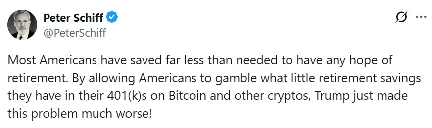 金融の世界の誰もがこのニュースを歓迎したわけではありません。ゴールドの擁護者で暗号評論家のピーター・シフは、この開発が彼が米国の悲惨な退職貯蓄のギャップと見なすものを悪化させる可能性があると警告しました。
