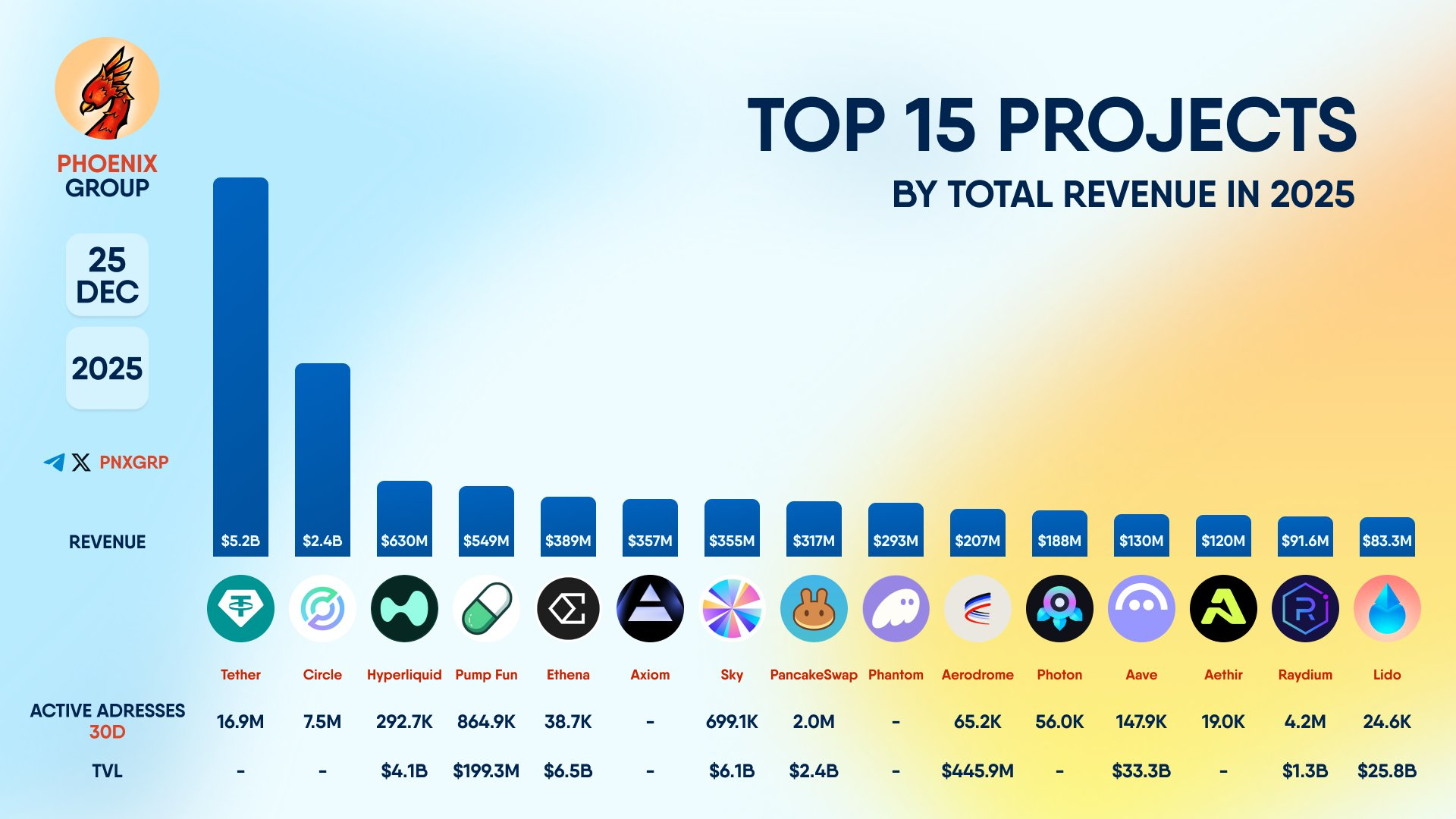 Aave は 2025 年の収益でトップ 15 の仮想通貨プラットフォームに入る。出典: X/Phoenix
