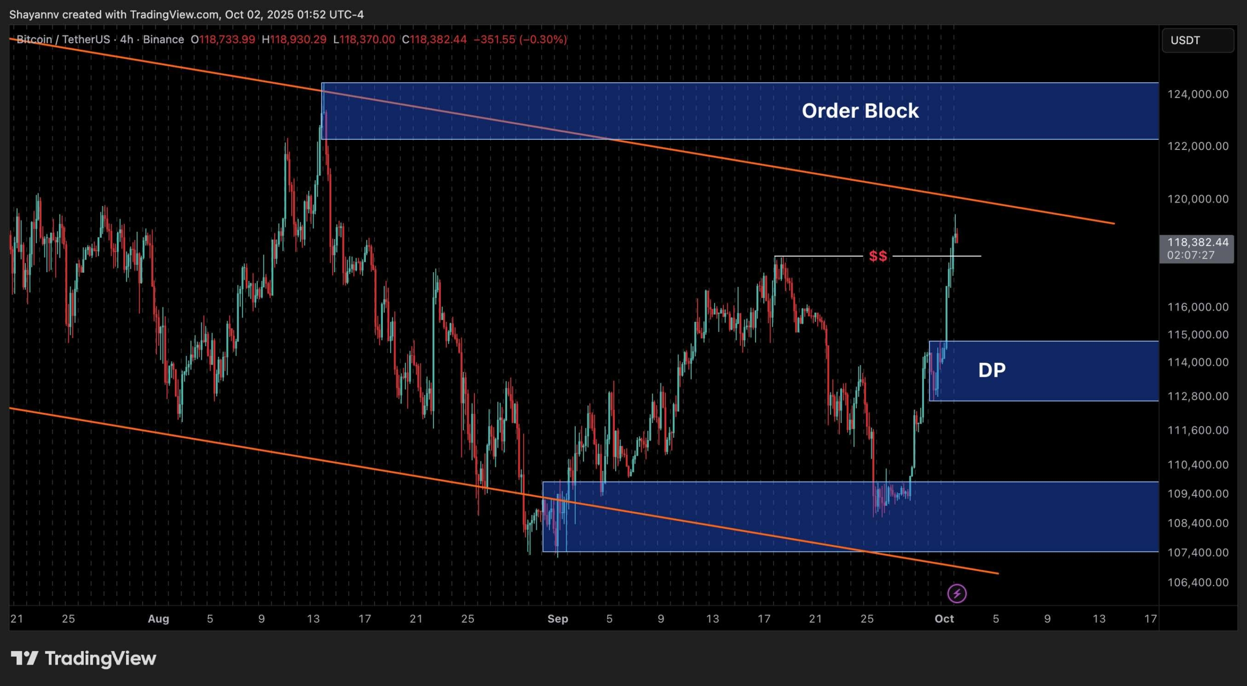 毎日の時間枠では、BTCは100日間のMA(114K)を回収し、統合範囲の中間点から急増し、12万ドルから12万4,000ドルの供給ブロックのすぐ下にある$ 118Kゾーンに押し込まれました。この領域は、事前の分布からの主要な注文ブロックと一致しており、重要なレベルになります。