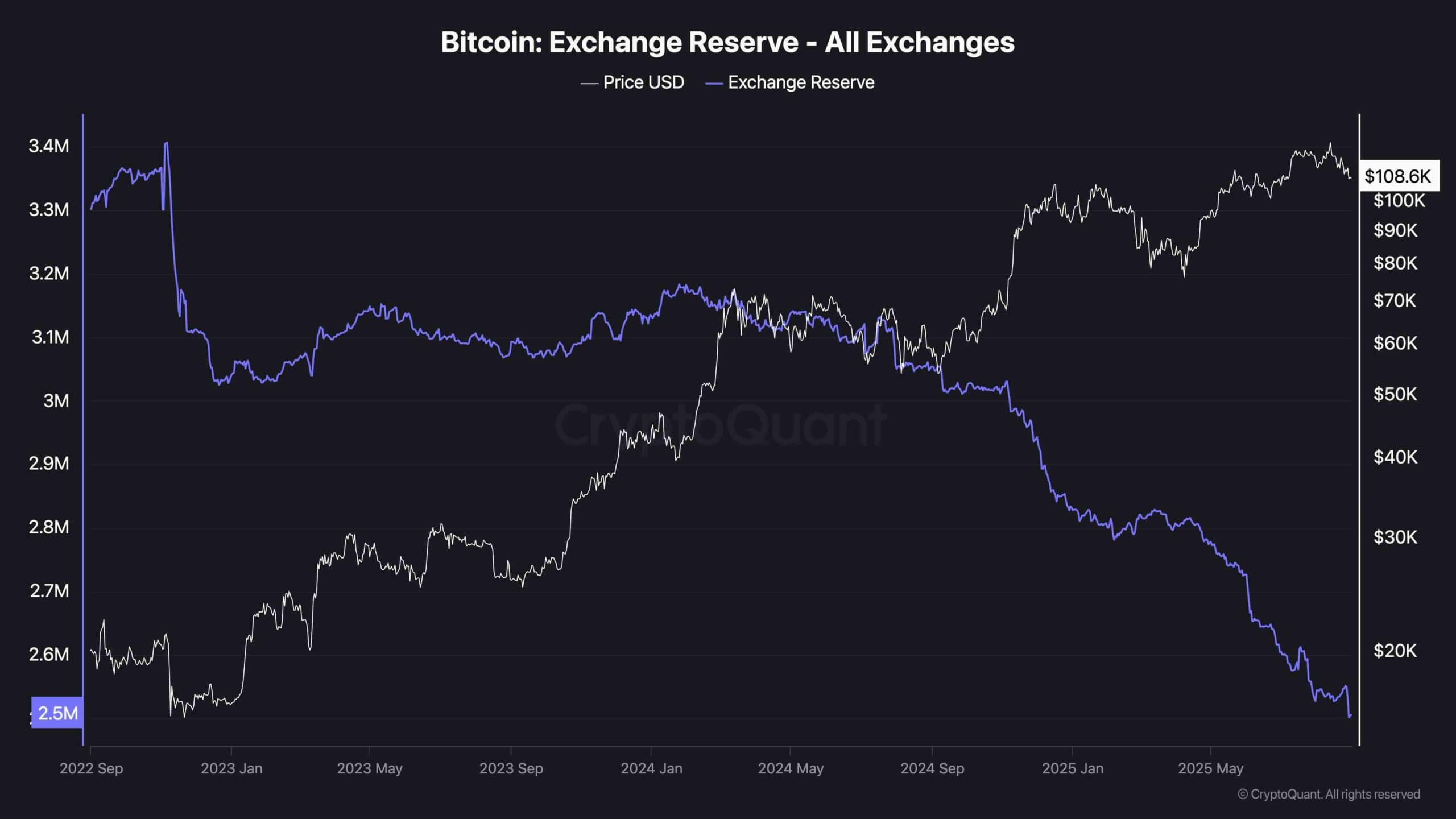 このチャートは、ビットコインの交換用予備とその価格を示しています。紫色のラインは、すべての交換にわたって保持されている保護区を示していますが、ホワイトラインはビットコインの米ドルの価格を追跡します。際立っているのは、今日まで続いている2024年の初め以来、交換準備金の持続的な減少です。
