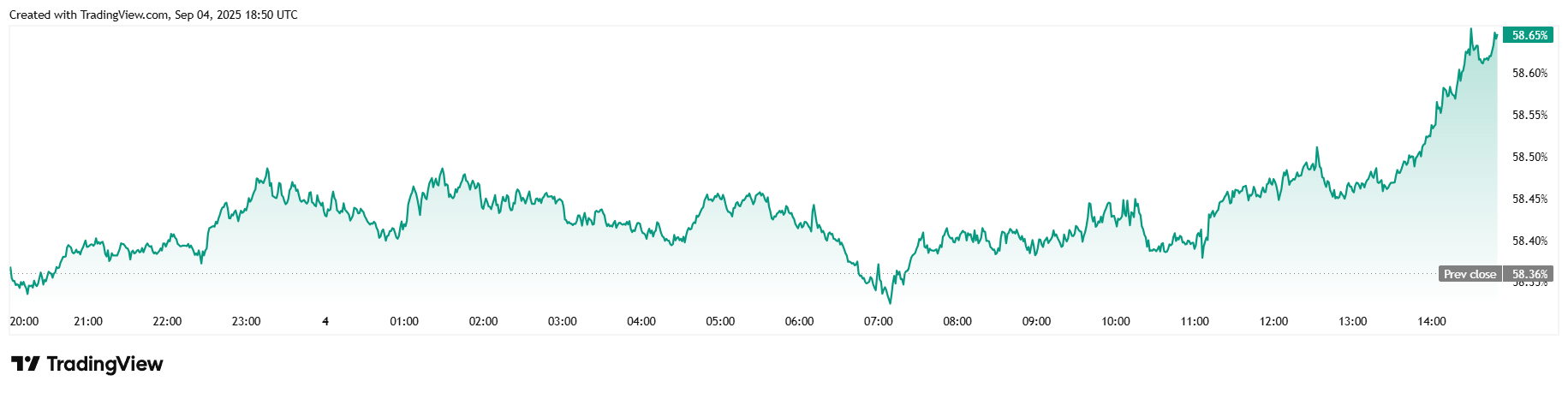 その日の取引量は、執筆時点で8.77%減少し、577億5,500万ドルになりました。また、時価総額は2.19兆ドルで1.55%減少しましたが、ビットコインの優位性は0.48%増加して58.65%増加しました。