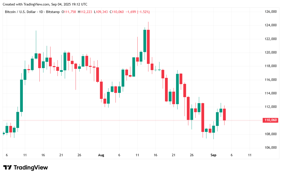 Bitcoinは、報告時に110,122.90ドルで取引され、1日は1.59%減少し、過去1週間で2.25%減少していました。 CoinMarketCapのデータは、過去24時間で暗号通貨が109,347.23ドルから112,297.39ドルの間で取引されていることを示しています。