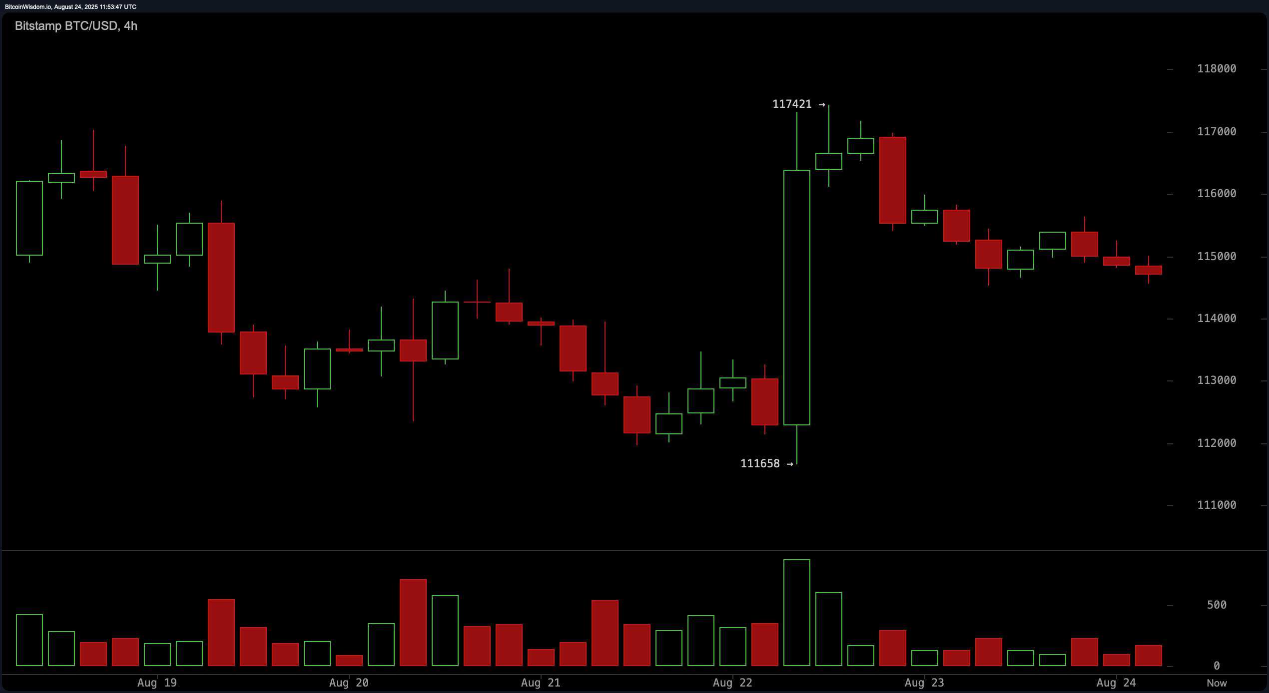 2025年8月24日にBitStamp経由のBTC/USD 4時間チャート。