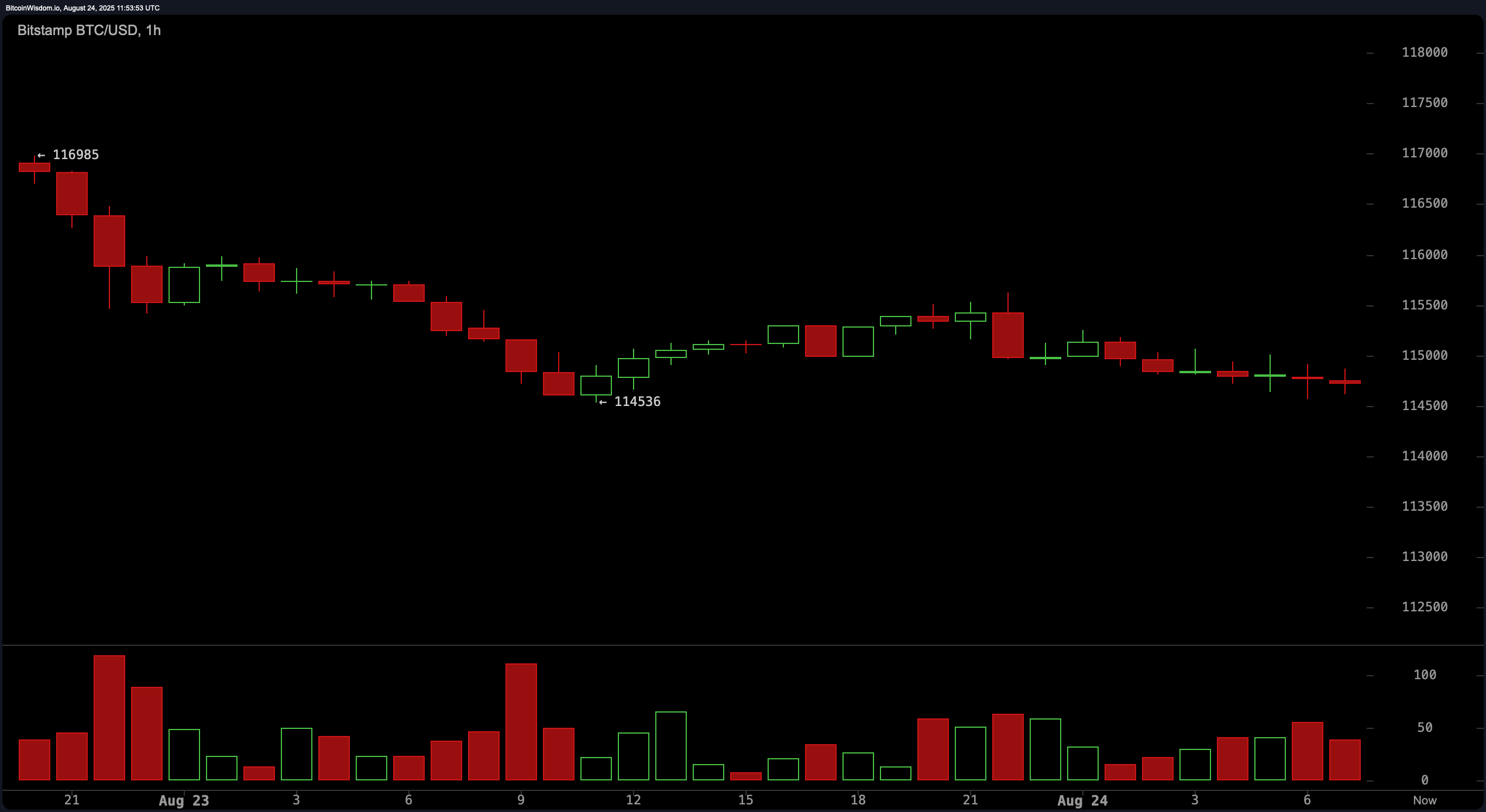 2025年8月24日にBitStamp経由のBTC/USD 1時間チャート。