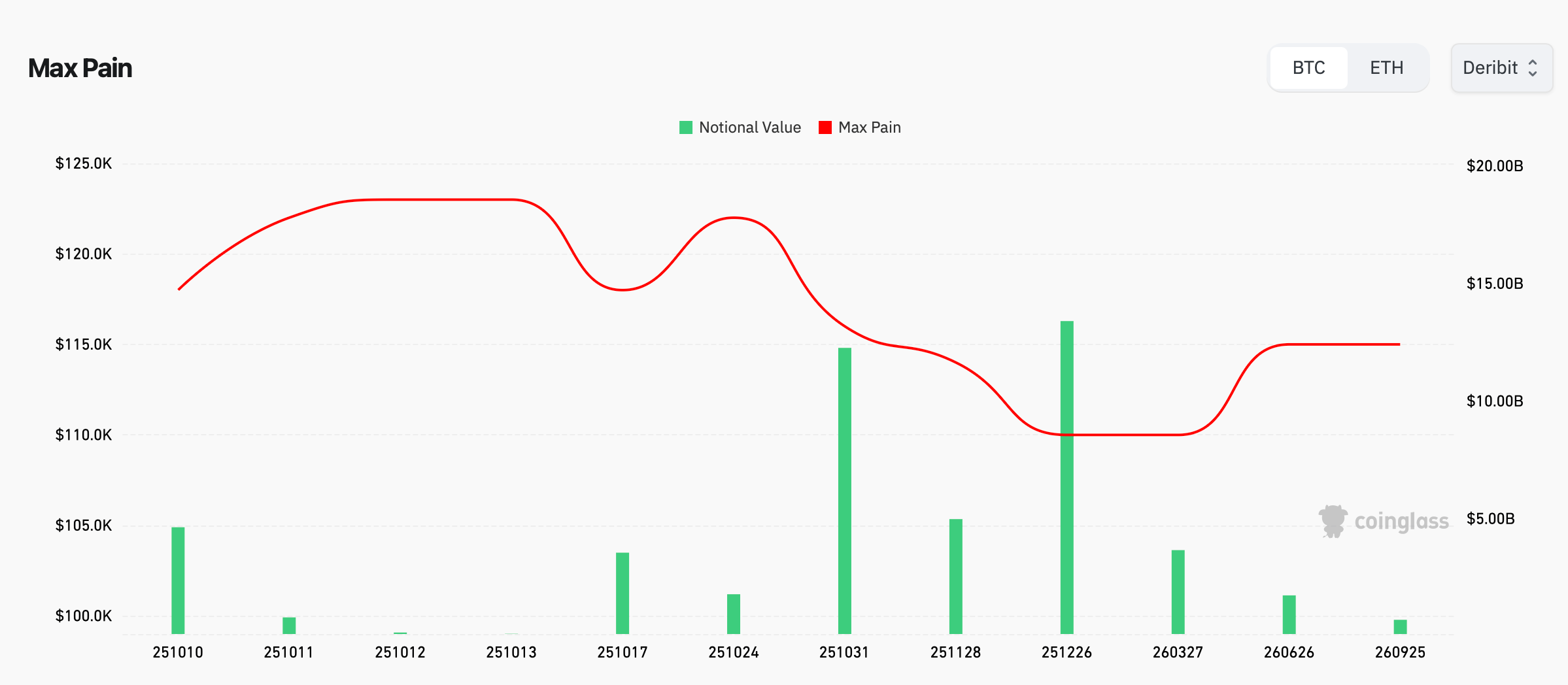 一方、ほとんどのオプションが無価値で期限切れになる価格水準を表す最大ペインポイントは12万ドル付近で推移しており、期限が近づくにつれて引力がかかる可能性のある領域となっている。