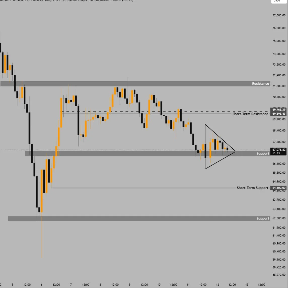短期的には、ビットコインは昨日以来67,000ドル付近のサポートを守っている。買い手は引き続きこの水準で介入し、さらなる下落を阻止している。一方、より低い時間枠ではトライアングルフォーメーションが出現し、差し迫ったブレイクアウトを示唆することがよくあります。レジスタンスを上回るかサポートを下回る決定的な動きは、次の短期トレンドを定義する可能性があります。