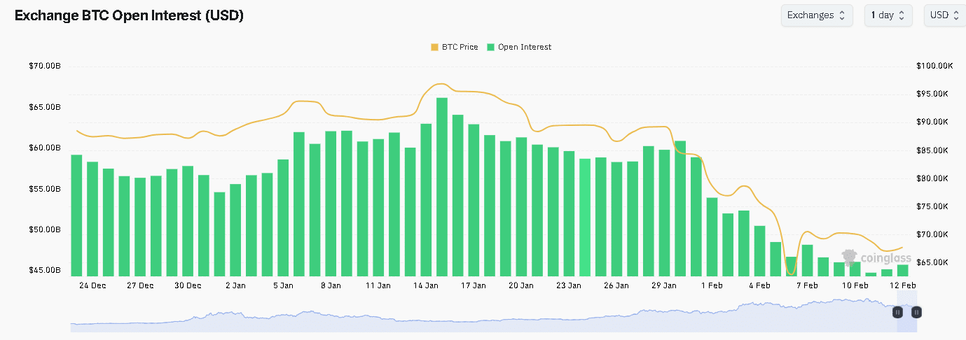 派生データは、現在の設定に別のレイヤーを追加します。コイングラスによると、ビットコイン取引所の建玉は、最近のピークだった1月15日の660億ドルから現在は457億ドルまで急減したという。建玉の下落は、レバレッジを活用したポジショニングの低下を反映していることが多く、ボラティリティを制限する可能性があるだけでなく、投機的な勢いが衰えていることを示す可能性もあります。