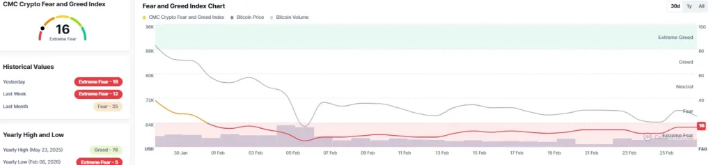 同様に、市場のムードもすでに脆弱だ。 CoinMarketCap Fear & Greed Index は 16 で、「極度の恐怖」に陥っています。このような状況では、トレーダーは多くの場合、より安定していると認識される資産に方向転換します。この流れは代替トークンではなくビットコインに利益をもたらす傾向があり、 $ETH 自信が薄れると、より鋭い動きにさらされます。