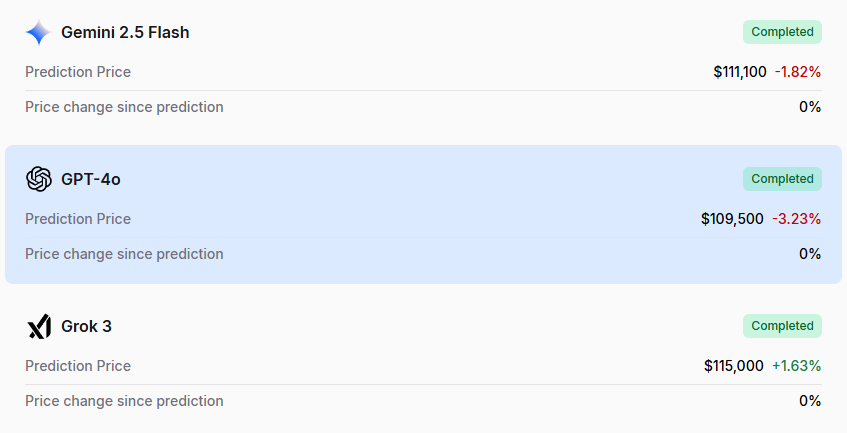 一方、ジェミニ2.5とGPT-4Oは弱気でした。 Googleのモデルは111,100ドルの価格を予測し、1.82%の潜在的なマイナス面を見ましたが、Openaiのカウンターパートはさらに低くなり、価格は109,500ドルで、3.23%の欠点がありました。