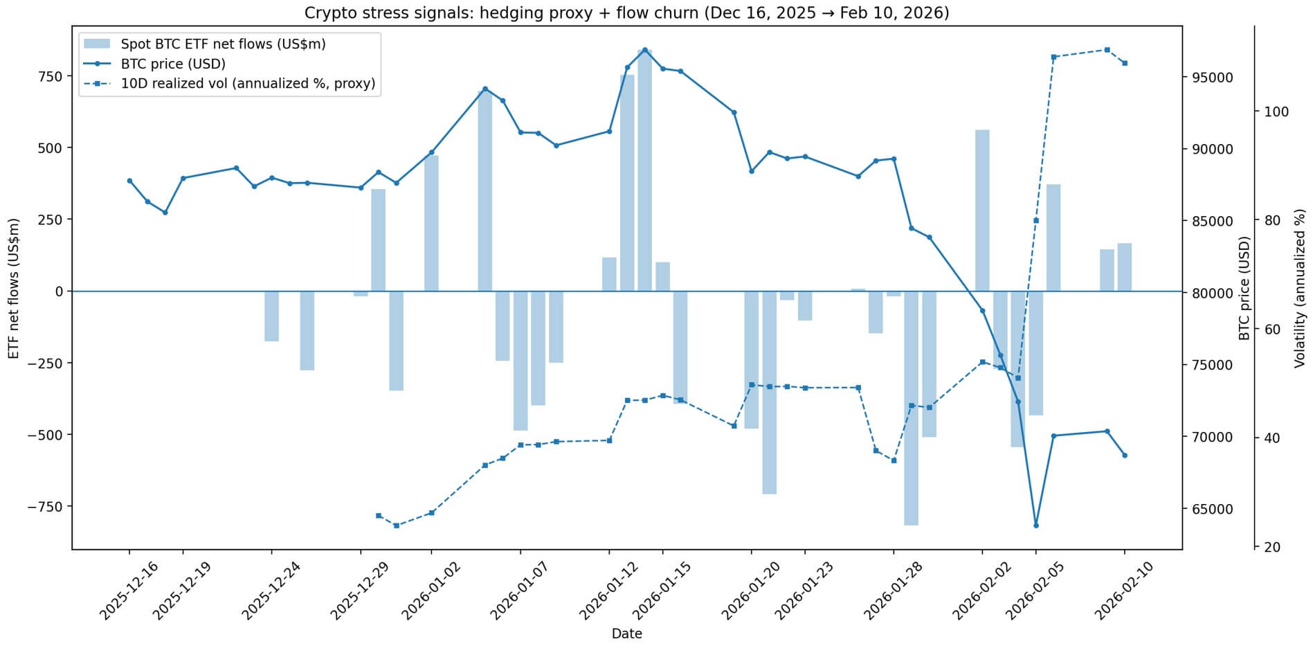 スポットビットコインETFのフローも、確信ではなく体制の不確実性について同様の物語を伝えています。