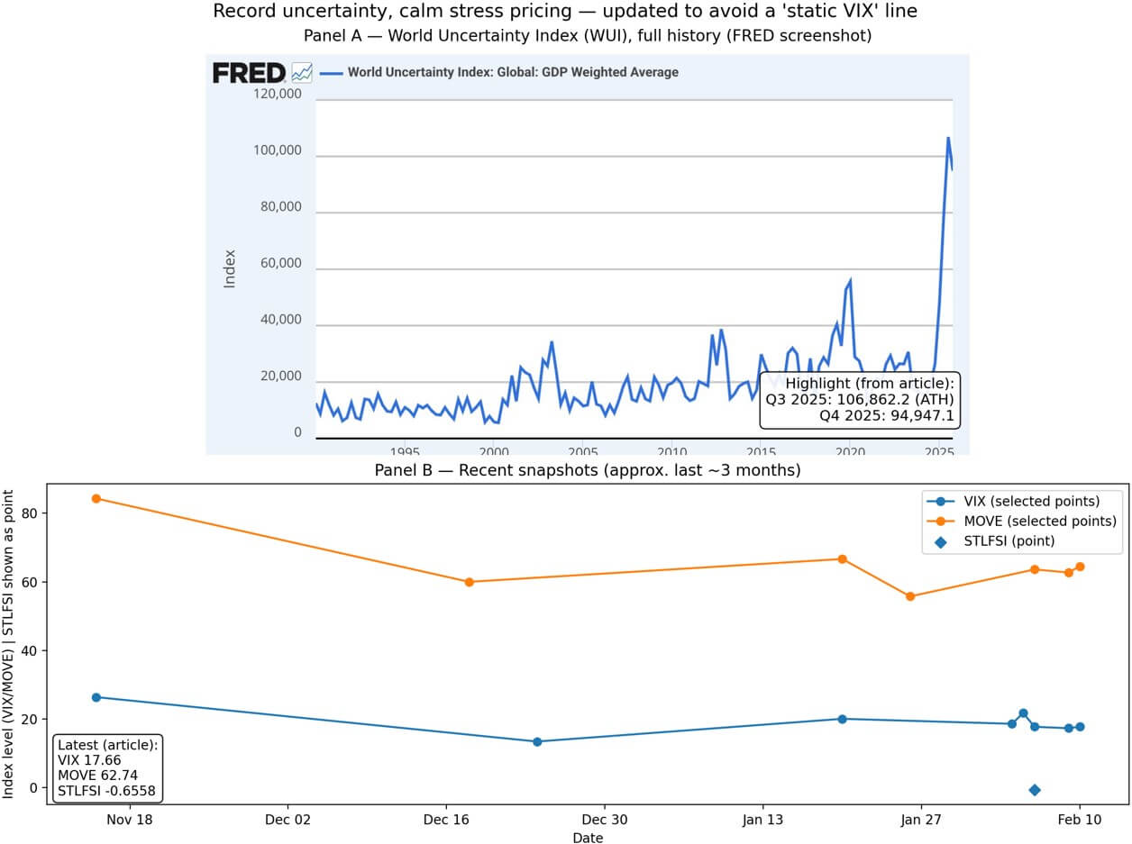 現在の状況が異常なのは、金融状況の緩和やストレス指標の急上昇もなく、WUIが記録的な水準に達していることだ。市場はパニックも安心も織り込んでいない。