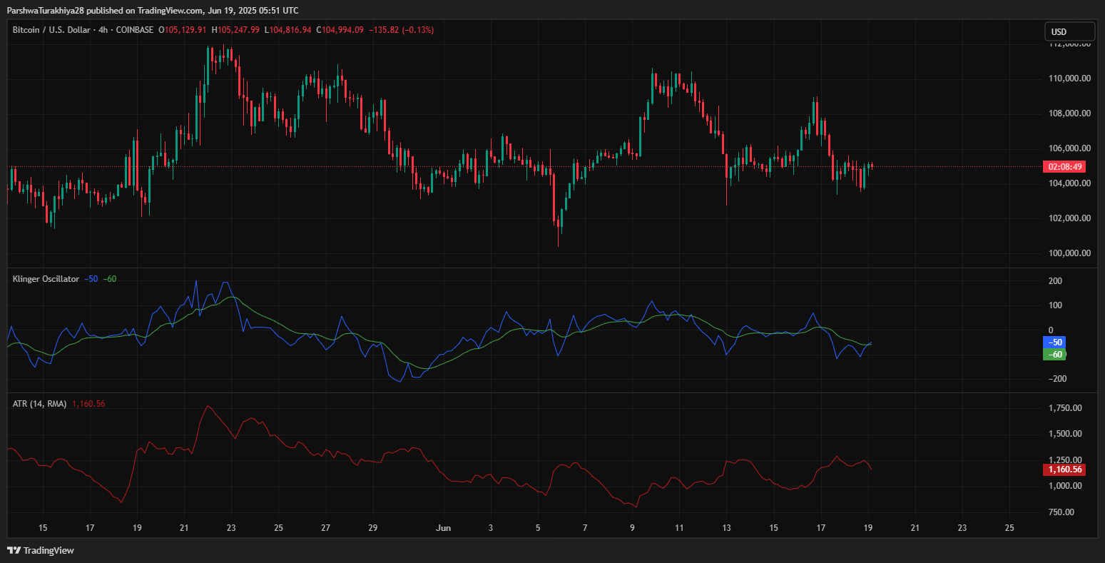 最近の減少は、30分間と4時間のチャートの両方で繰り返される弱気拒絶によって示されるように、108,000ドルの抵抗に近い技術的拒否によって主に促進されています。さらに、クリンガーオシレーターは負に変わり、真の強度指数(TSI)は-0.57でゼロを下回り、勢いがまだ弱気であることを示唆しています。