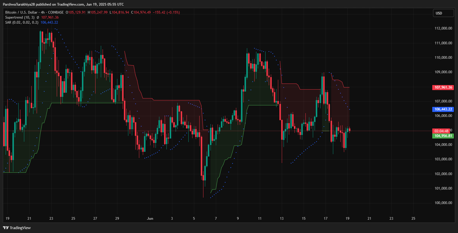 利点として、抵抗はインジケータの合流によってキャップされます。 20/50/100 EMAクラスターは105,960ドルで、最初の障壁として機能します。すぐに、放物線のSARは抵抗を106,443ドルで信号しますが、スーパートレンドインジケーターは別の天井を107,961ドルとマークします。この積み重ねられたオーバーヘッド抵抗は、上向きの運動量での現在の一時停止を説明しています。