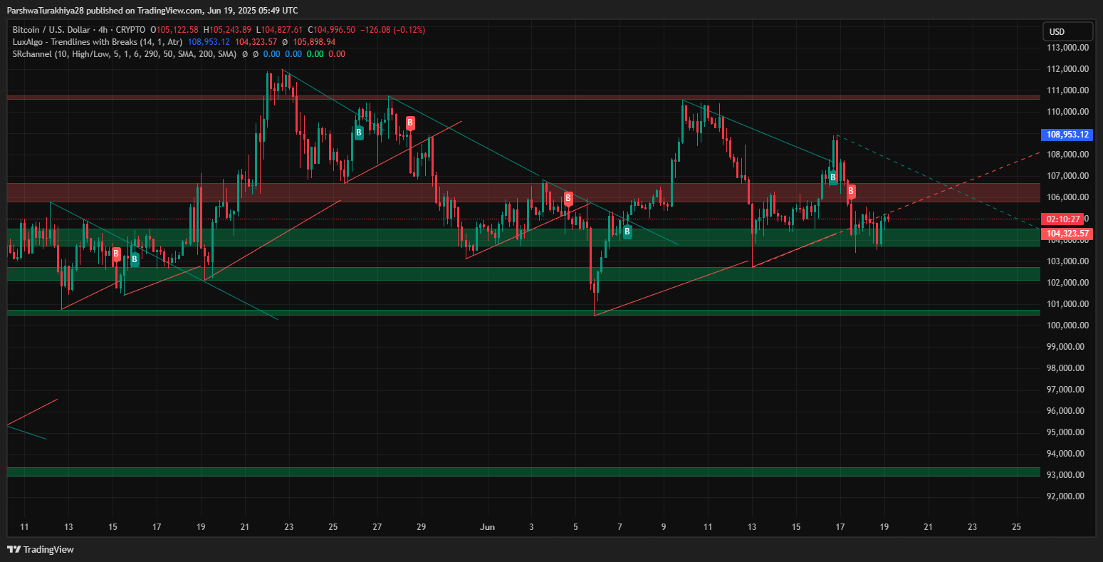 ビットコインの4時間のチャートは、トレーダーが監視するべき主要なサポートと抵抗レベルを備えた明確な技術的環境を示しています。即時のサポートは104,300ドルから103,750ドルです。この範囲は、最近のセッションで重要な需要ゾーンとして機能し、より深いマイナスサイドの動きを防ぎ、販売圧力の増加期間中にビットコインの価格アクションのために一時的なフロアを提供しています。