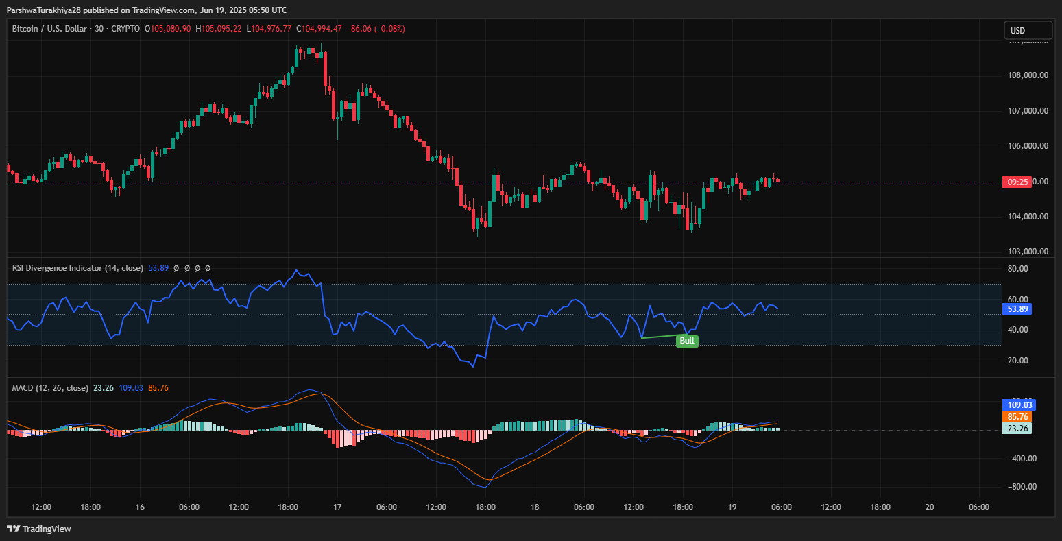 30分間のチャートでは、RSIは現在53.89であり、正中線のすぐ上に座って中立の勢いを示しています。しかし、MACDは正の領域にとどまり、わずかな強気のクロスオーバーがプレーしており、バイヤーが105,300ドルを取り戻した場合、上向きの継続の可能性を示唆しています。