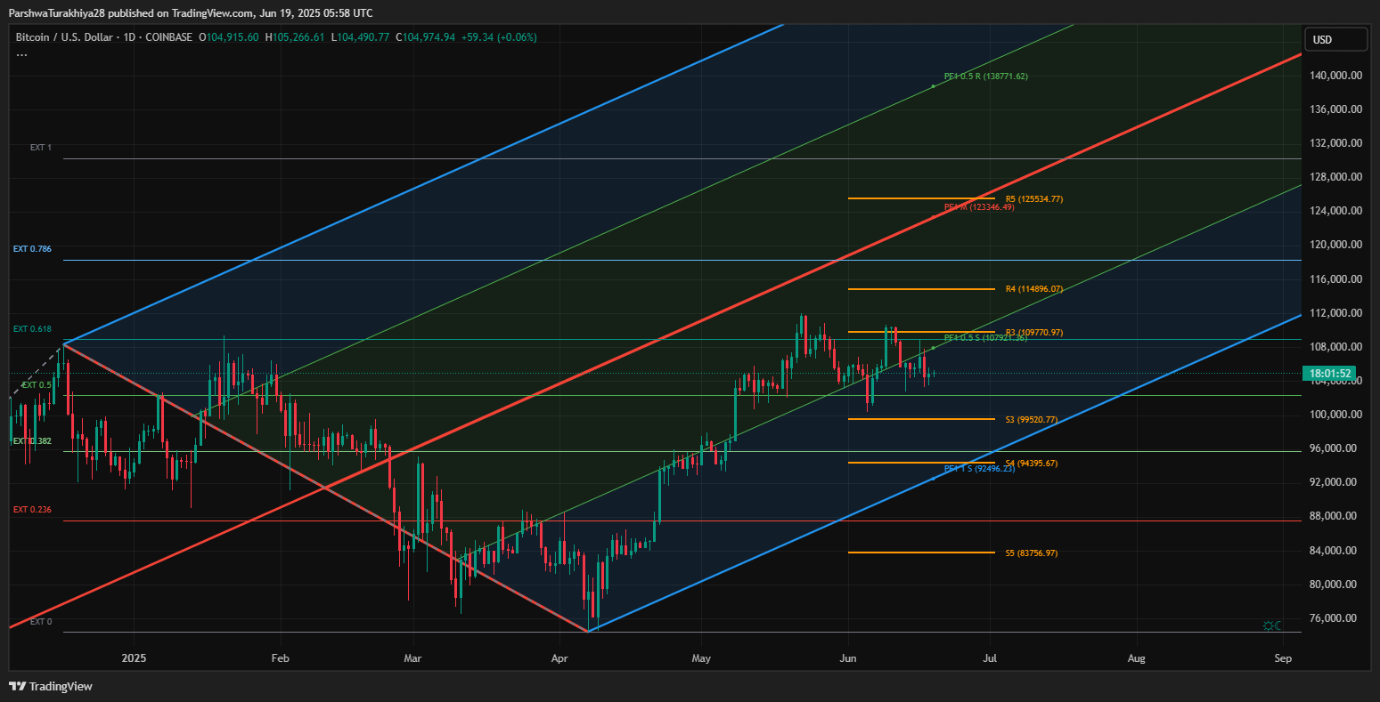 ビットコインは現在、毎日のフィボナッチピッチフォークに見られるように、下降する三角形とより広い上昇するチャネル構造の頂点に配置されています。 BTCがボリュームで106,000ドルを超えると、109,000ドルに向かって集会があり、潜在的に114,000ドルが実行可能です。