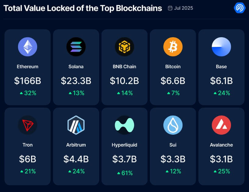 NFTSは7月に波を起こしましたが、Defiも印象的な成長を経験し続けました。 Dappradarは、Defiのロックされた資産の総額(TVL)が30%以上急増し、月末までに2,590億ドルに達したと報告しました。