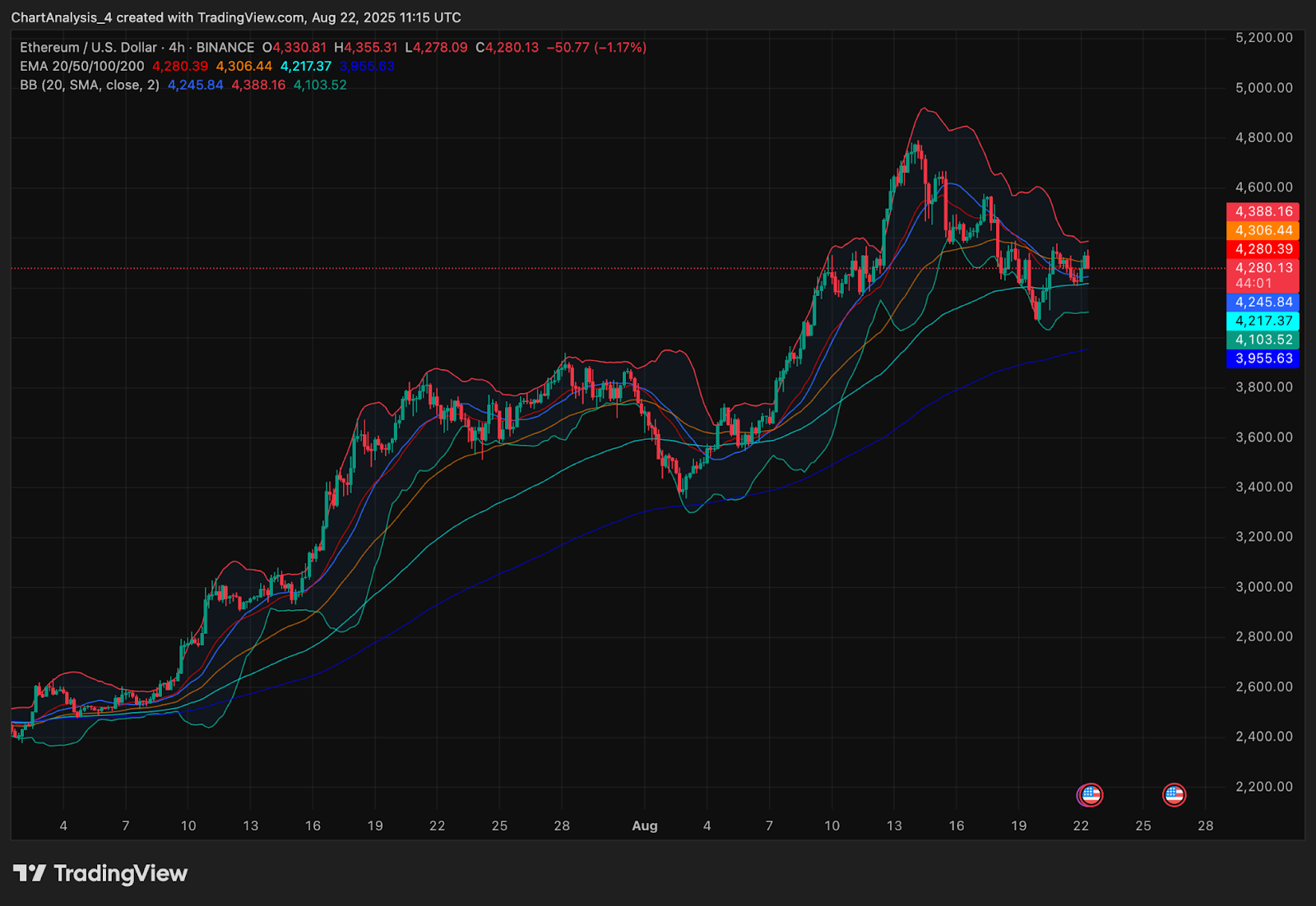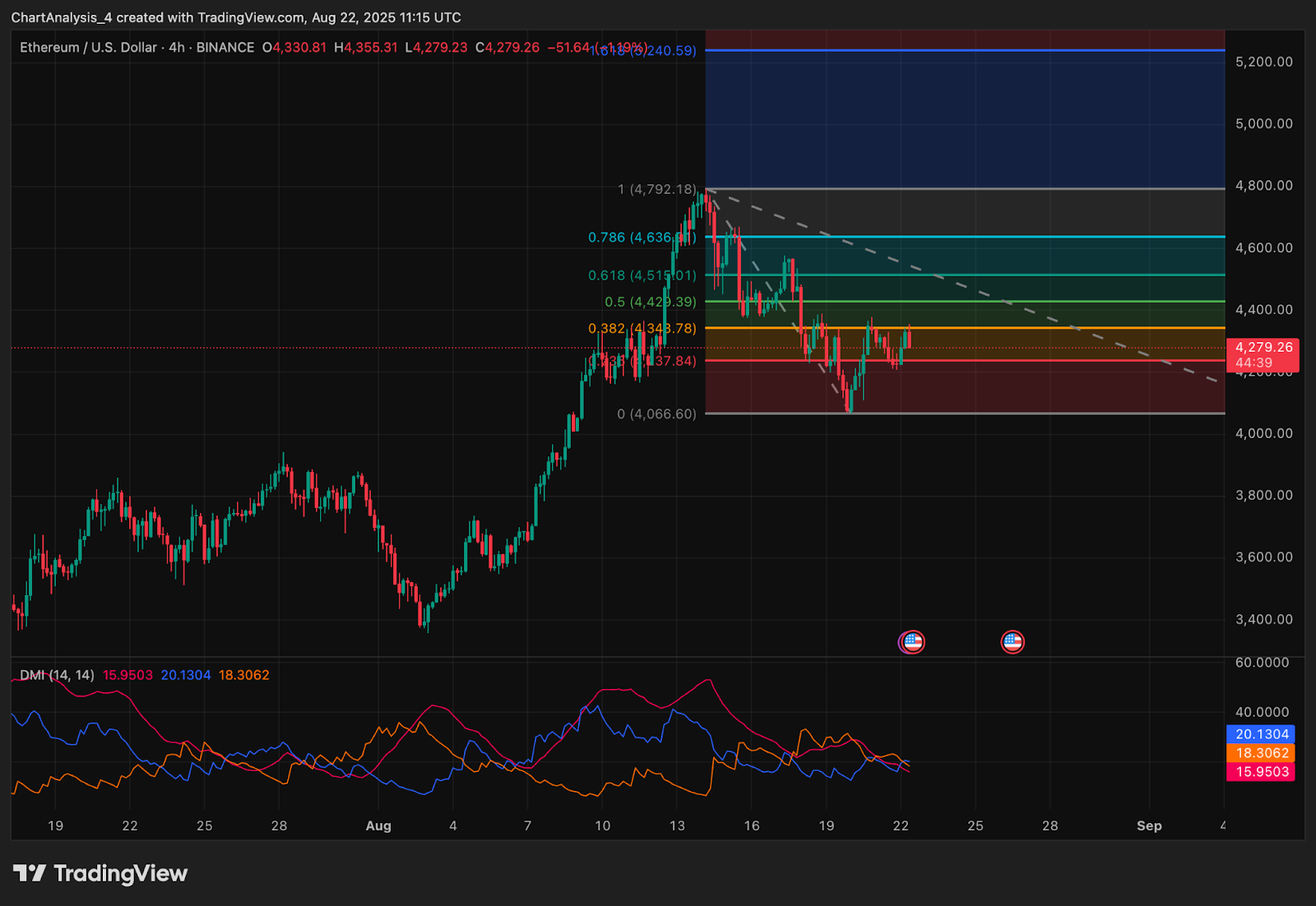 4時間の時間枠では、フィボナッチのリトレースメントレベルが現在の闘争の概要を示しています。価格は0.382レベル($ 4,343)でホバリングしていますが、0.5のリトレースメント(4,428ドル)と0.618のリトレースメント(4,511ドル)が即時抵抗を形成しています。ここでの拒否は、ETHが修正サイクル内にロックされたままであることを確認できますが、0.618を超えるブレイクアウトは4,636ドルと4,792ドルに向かう道を再開する可能性があります。