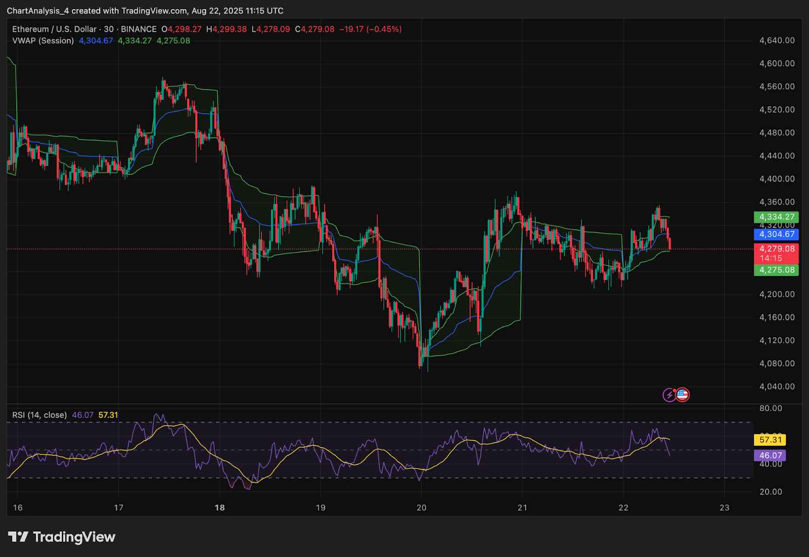 30分間のチャートでは、RSIは57.0を超えて維持に失敗した後、46.0に冷却されました。一方、VWAPはETH取引が4,304ドルを下回ることを示しており、シグナル価格はセッション価値レベルを保持するのに苦労しています。 4時間チャートの降順チャネルは価格を圧縮し続けており、レジスタンスは4,380〜4,400ドル近く、複数回拒否されています。