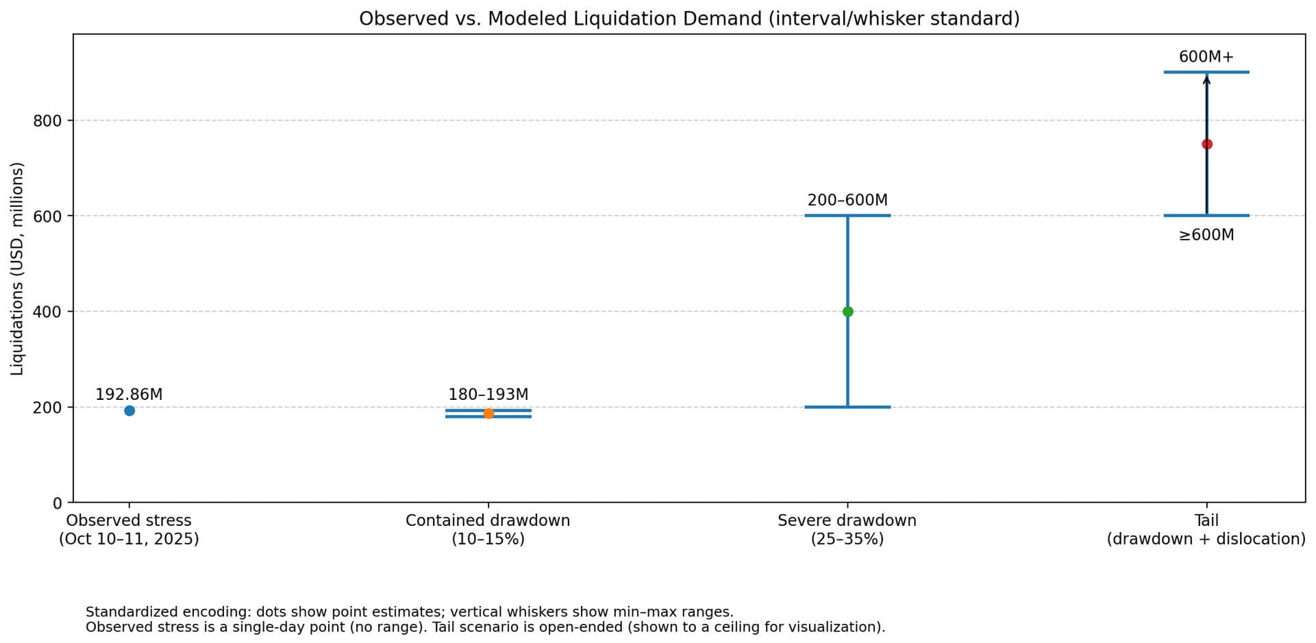 3 つの DeFi シナリオは、妥当な結果の範囲を枠組みしており、それぞれが投機的な予測ではなく、観測された清算規模に基づいています。