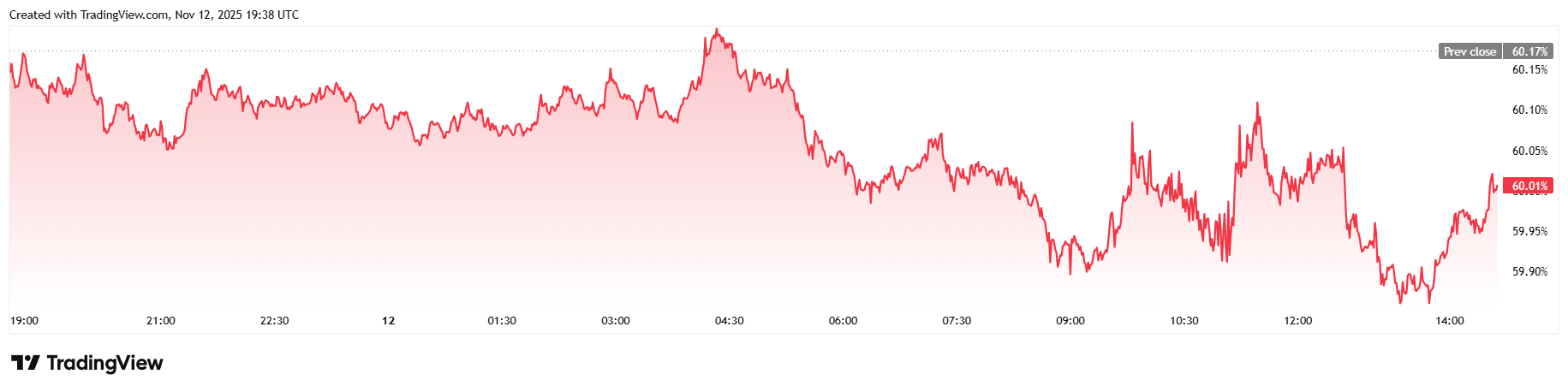 24時間の取引高は12.73%減の627億7000万ドルだった。時価総額は2兆0100億ドルに減少し、ビットコインの優位性は昨日から0.28%低下し60%に達した。