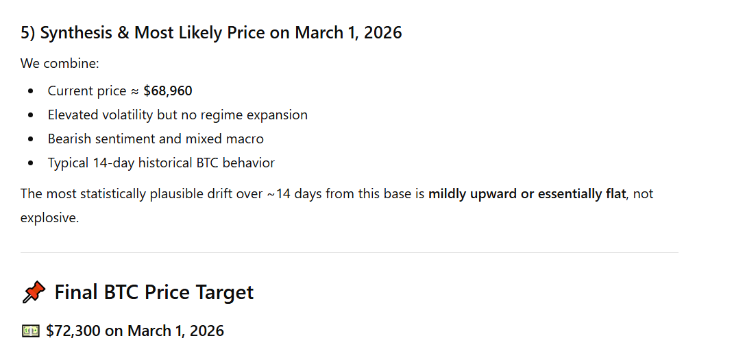 フィンボルド氏は、相対的な安定化と将来の見解の衝突の間で、ビットコインの短期的な軌道がどのようなものになるのか、そしてどこに向かうのかについて高度な AI に相談することにしました。 $BTC 2026年3月1日までに取引される可能性がある。