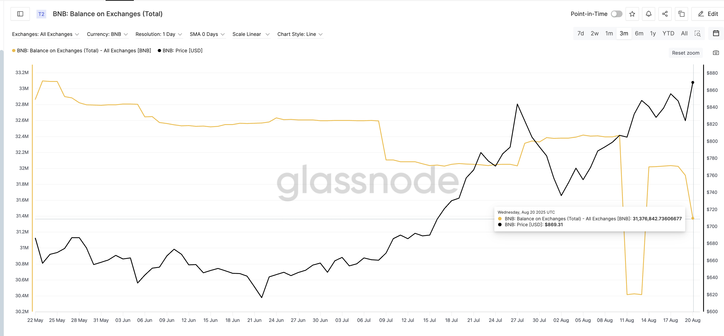 次に、Exchangeバランスを見てください。 8月19日から20日の間に、BNBの価格は824ドルから869ドルに跳ね上がりました。同じ期間に、Exchange残高は31.91百万から31.38百万bnbに減少しました。