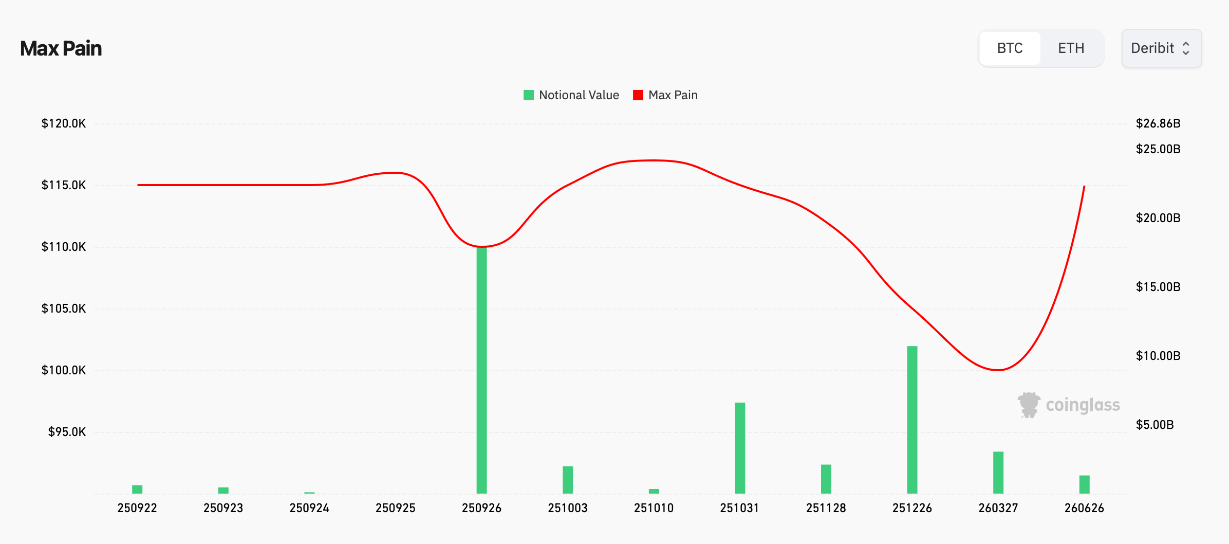 coinglass.comの統計によると、デリビットの最大痛。マックスの痛みは、最大数のオプション契約(通話と配置の両方)が無価値に拡大し、オプション所有者に最も経済的損失を引き起こす価格です。マーケットメーカーは通常このレベルでヘッジするため、多くの場合、価格アクションの近くで価格アクションの磁石として機能します。