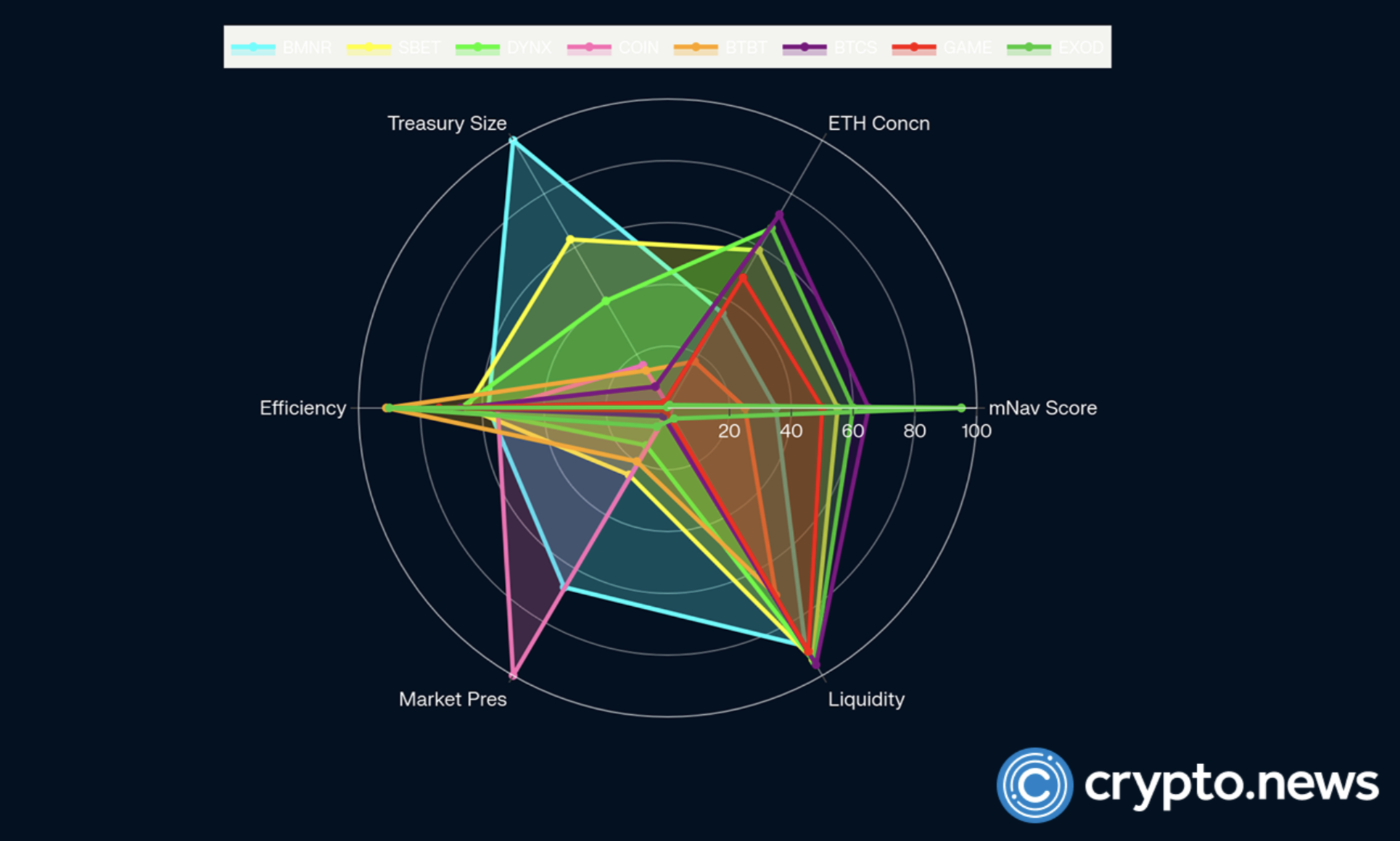 ただし、すべてのETH財務省株が平等に作成されるわけではありません。 crypto.newsのレーダー分析によると、BitmineやSharplinkなどの企業は、財務省の規模だけでなく、流動性と効率性もリードしており、制度的観点からより投資可能にしています。特に、SBETは、ETHの集中、効率、流動性にわたって強いバランスを示しています。これは、持続可能な評価の成長をサポートできるトリオです。