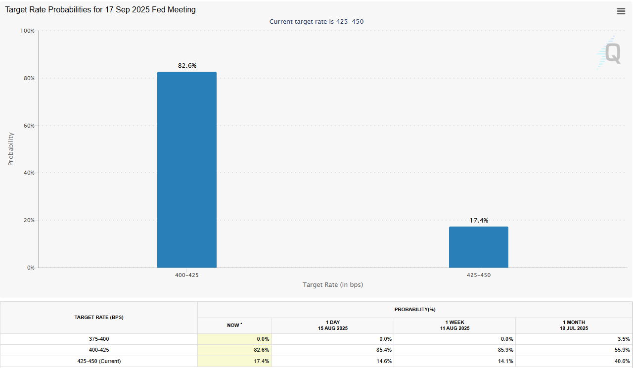 CME GroupのFedWatchツールの最新の推定によると、市場は9月17日の次の連邦公開市場委員会会議でFRBが安定している可能性が82%の確率で価格設定されています。