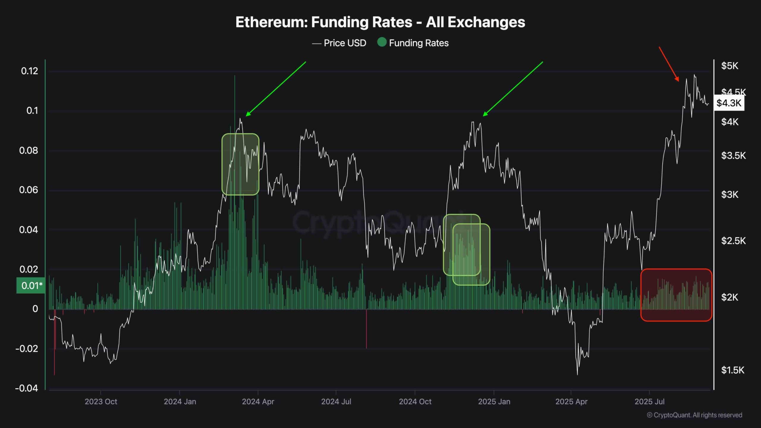 Ethereumの最後の3つの主要な高値を比較する際に、取引所全体の資金調達率は重要なコンテキストを提供します。 2024年初頭の最初のピーク時に、資金調達率は0.08を超えて急上昇し、過度の長いポジショニングと投機的需要を反映しています。過熱したレバレッジが解き放たれたため、資産はすぐにトップになりました。