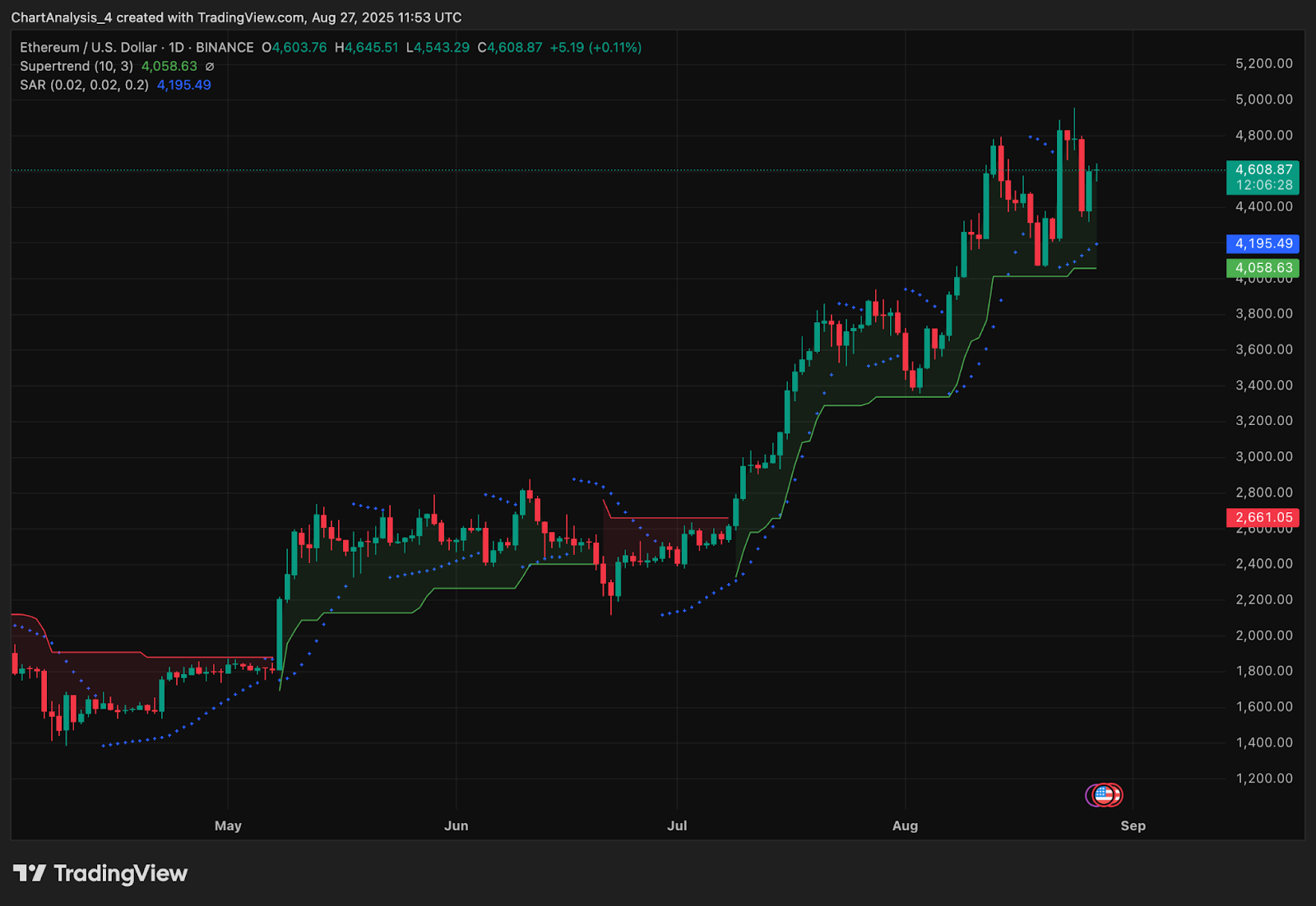 RSIは53.1であり、最近の過剰なレベルからの引き戻しの後、勢いが中性であることを示唆しています。 RSIで60を超えるプッシュは、ブレイクアウトの試みを示します。一方、毎日のチャートは、スーパートレンドのサポートを4,058ドル上に保持しているETHを示していますが、放物線のSARドットは価格を下回り、長期的な構造を強気に保ちます。