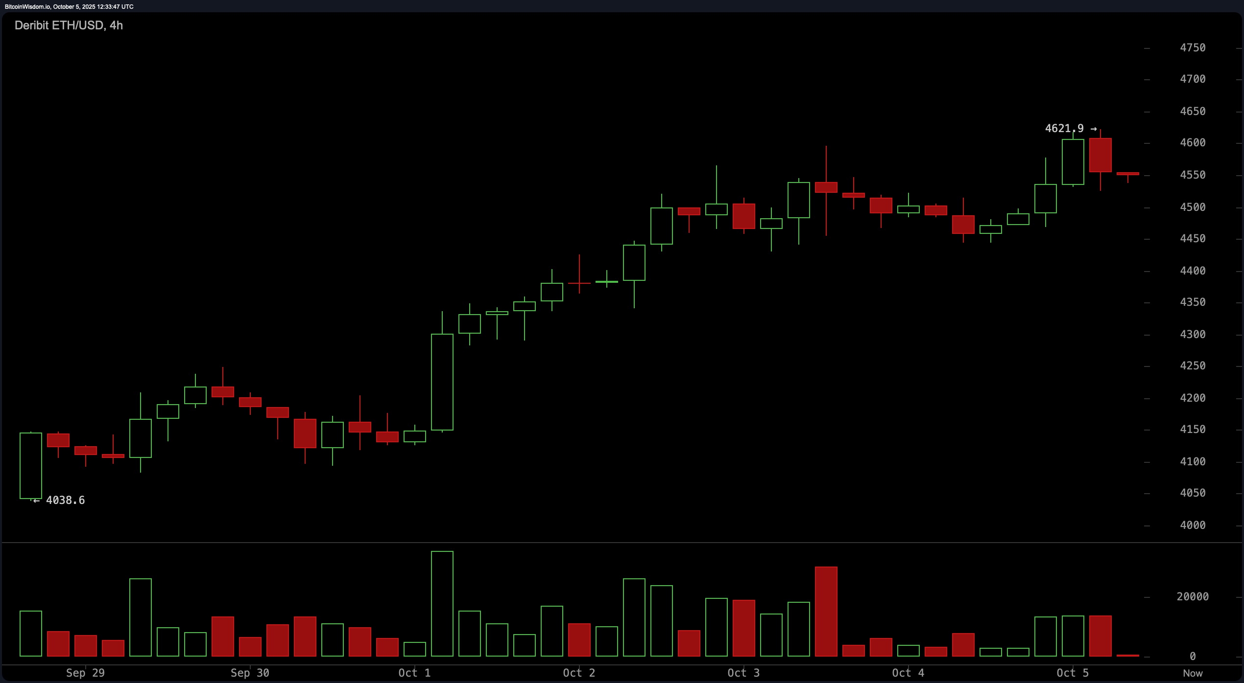 2025年10月5日にDeribit経由のETH/USD 4時間チャート。