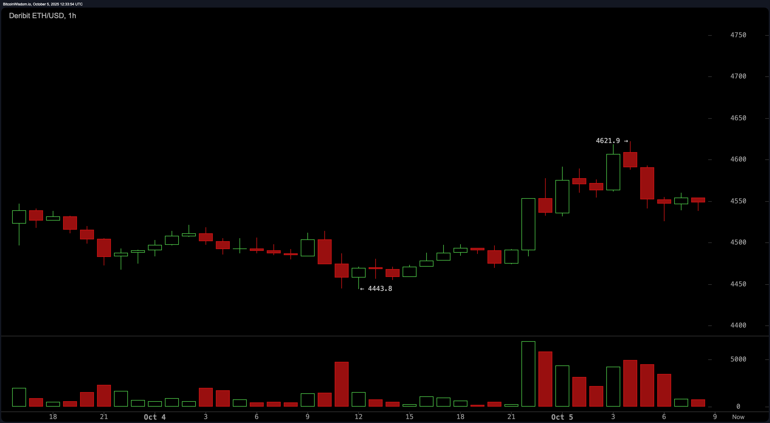 2025年10月5日にDeribit経由のETH/USD 1時間チャート。