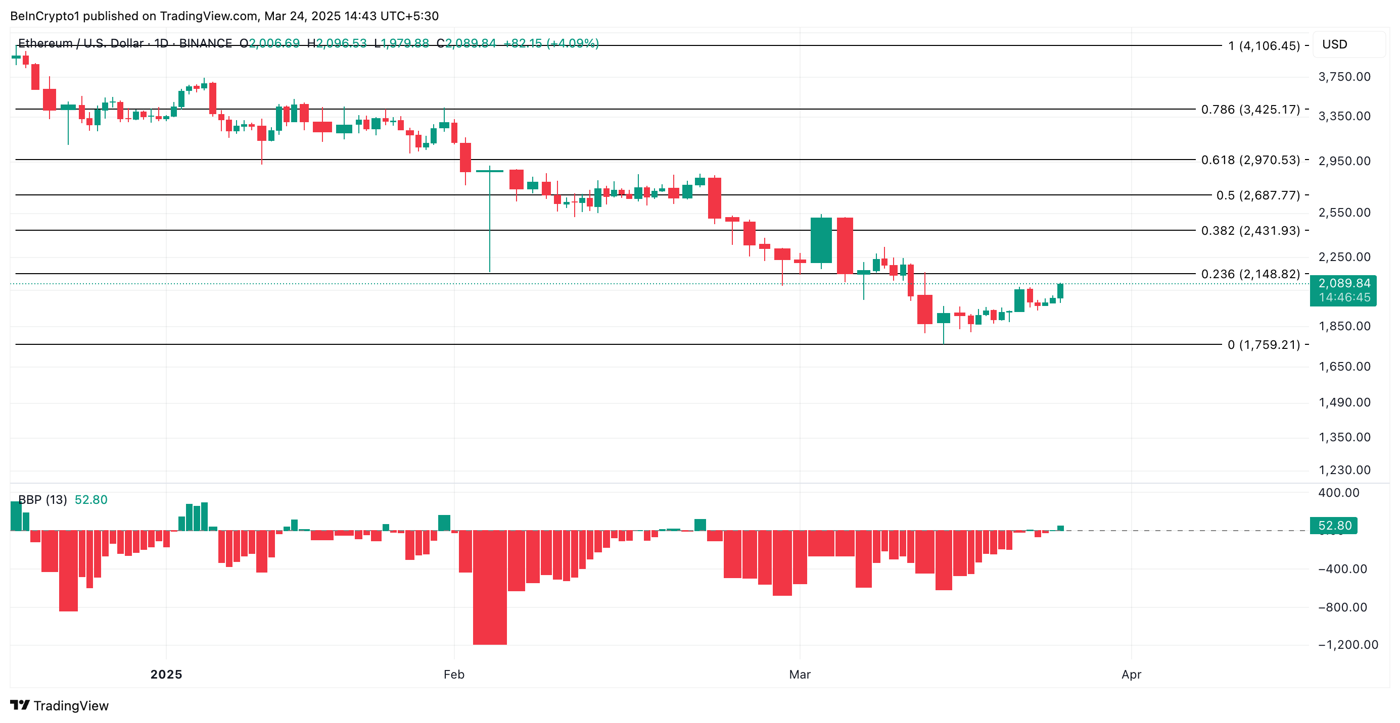 ETHは現在2,089ドルで取引されており、過去1日で4%の利益を記録しています。エルダーレイインデックスによって投稿された緑色のヒストグラムバーは、Altcoinに対する増大している強気のバイアスを反映しています。プレス時に52.80で、過去30日間で最高です。