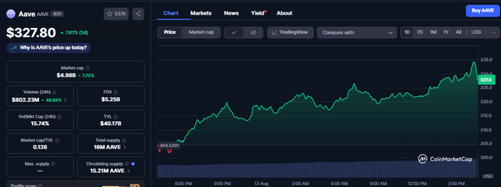 Aave Priceは、利益を1日の最低値から301ドルから10%以上延長して334ドルに拡大しました。