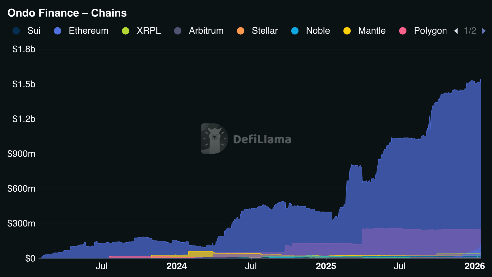 DefiLlamaのデータによると、トークン化プラットフォームとDeFiプロトコルであるOndo Financeのトータル・バリュー・ロックド(TVL)は今週20億ドルを突破し、過去最高を記録した。この数字は昨年3月初旬のTVLの2倍以上となっている。